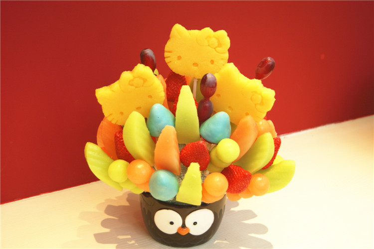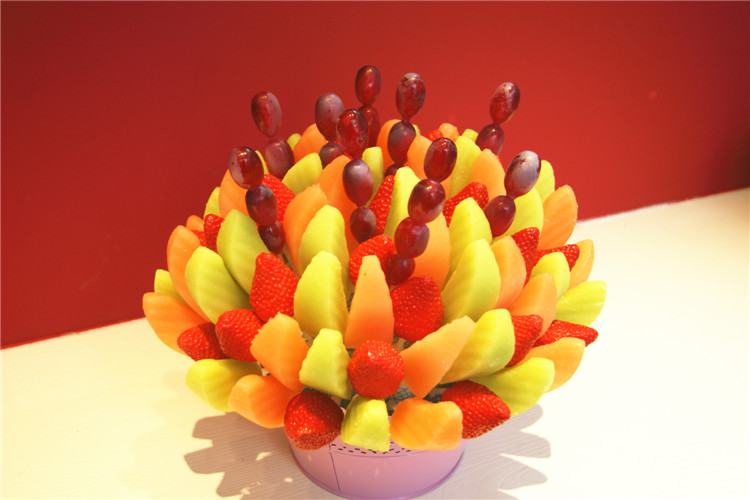 果麗美水果花采用的水果均選自全球最優(yōu)產(chǎn)地,菠蘿、香蕉來自菲律賓,網(wǎng)紋瓜來自緬甸、哈密瓜來自新疆、草莓為中國有機、紅提來自美國,搭配費列羅巧克力、美國杏仁、菲律賓椰蓉等進(jìn)口輔料,只為給你與眾不同的快樂!