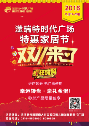 今日,全國性一年一度的“雙11”狂歡購物節(jié)拉開帷幕,我商場(chǎng)特于今日至13日舉行為期三天的“特惠家具節(jié)”。